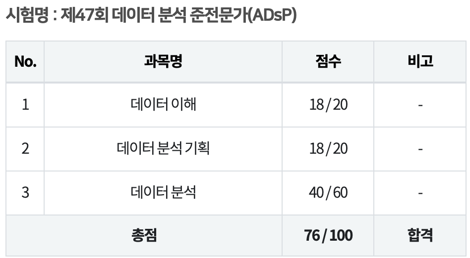 ADSPhttps://www.dataq.or.kr/www/sub/a_06.do 데이터자격검정 - 데이터자격시험, DAP, DAsP, SQLP, SQLD, ADP, ADsP.데이터자격시험, DAP, DAsP, SQLP, SQLD, ADP, ADsP.www.dataq.or.kr ADSP 시험일정https://www.dataq.or.kr/www/accept/schedule.do 데이터자격검정 - 데이터자격시험, DAP, DAsP, SQLP, SQLD, ADP, ADsP.데이터자격시험, DAP, DAsP, SQLP, SQLD, ADP, ADsP.www.dataq.or.kr ADSP 후기 우선 47회 adsp를 도전했다.나는 소프트웨어학과를 졸업했고, 데이터 분석이랑은 연관이 적었지만, AI에 대해 공부하..